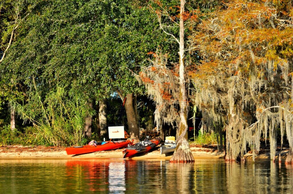 Spend the weekend camping and kayaking on beautiful Lake Moultrie. We’ll paddle to the campsite on a wooded island a little less than 2 ½ miles from the put in. Drop your gear and head out to explore one of Lake Moultrie’s largest wildlife management areas. Join in a naturalist guided freshwater marsh/swamp paddle and watch for white-tailed deer and bald eagles as you explore those cypress bays, tupelo swamps or paddle to other islands. Tours vary with season and opportunities. You could just relax at camp, catch a few bass and just hang out if you prefer. Your guide will teach you how to select a campsite, make a campfire and many other outdoor skills. Your guide will also cover kayaking and navigation skills during tours. Each evening enjoy breathtaking sunsets, star gazing and campfire fun. Camping packages with and without kayaks and camping equipment available. See packages/costs below photos. Reservations required – call 843-697-2812. We will email a list of recommended items you should bring after your tour is booked.